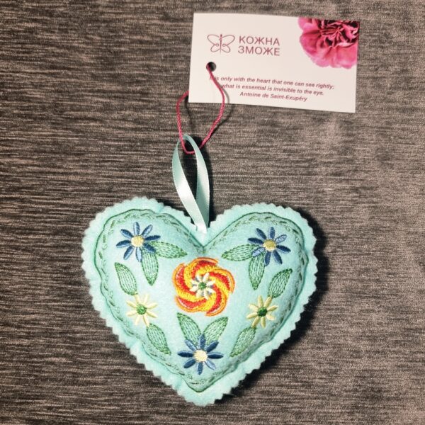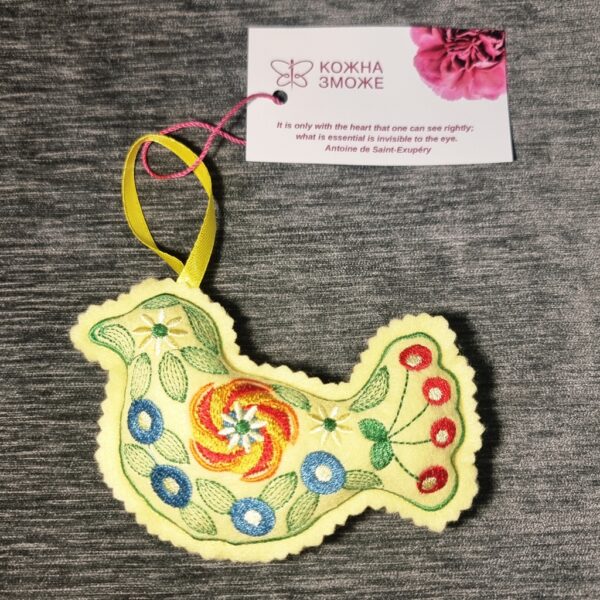 Вишивка на фетр, за мотивами наддніпрянських орнаментів. Підвіска – атласна стрічка довжиною 5-6 см. Кольори: блакитний, жовтий, персиковий. Розмір: 12х13 см.