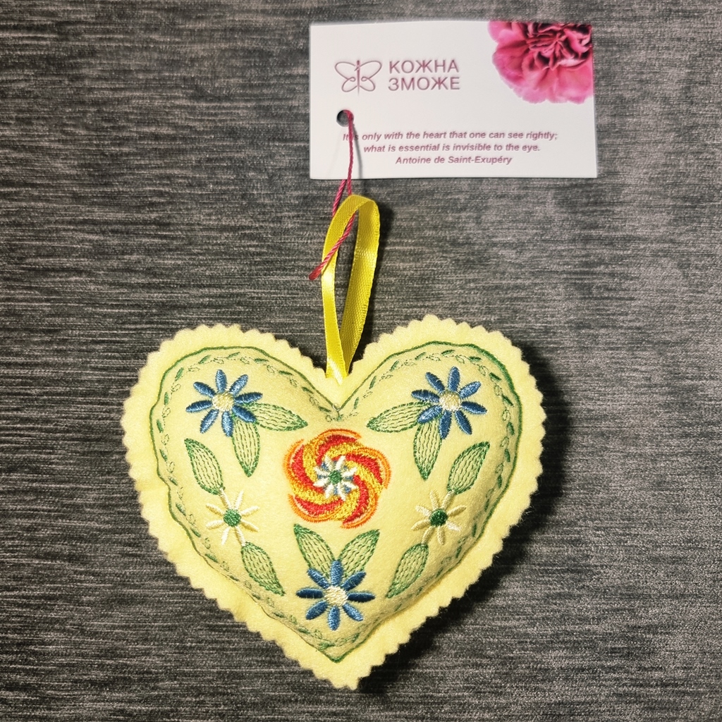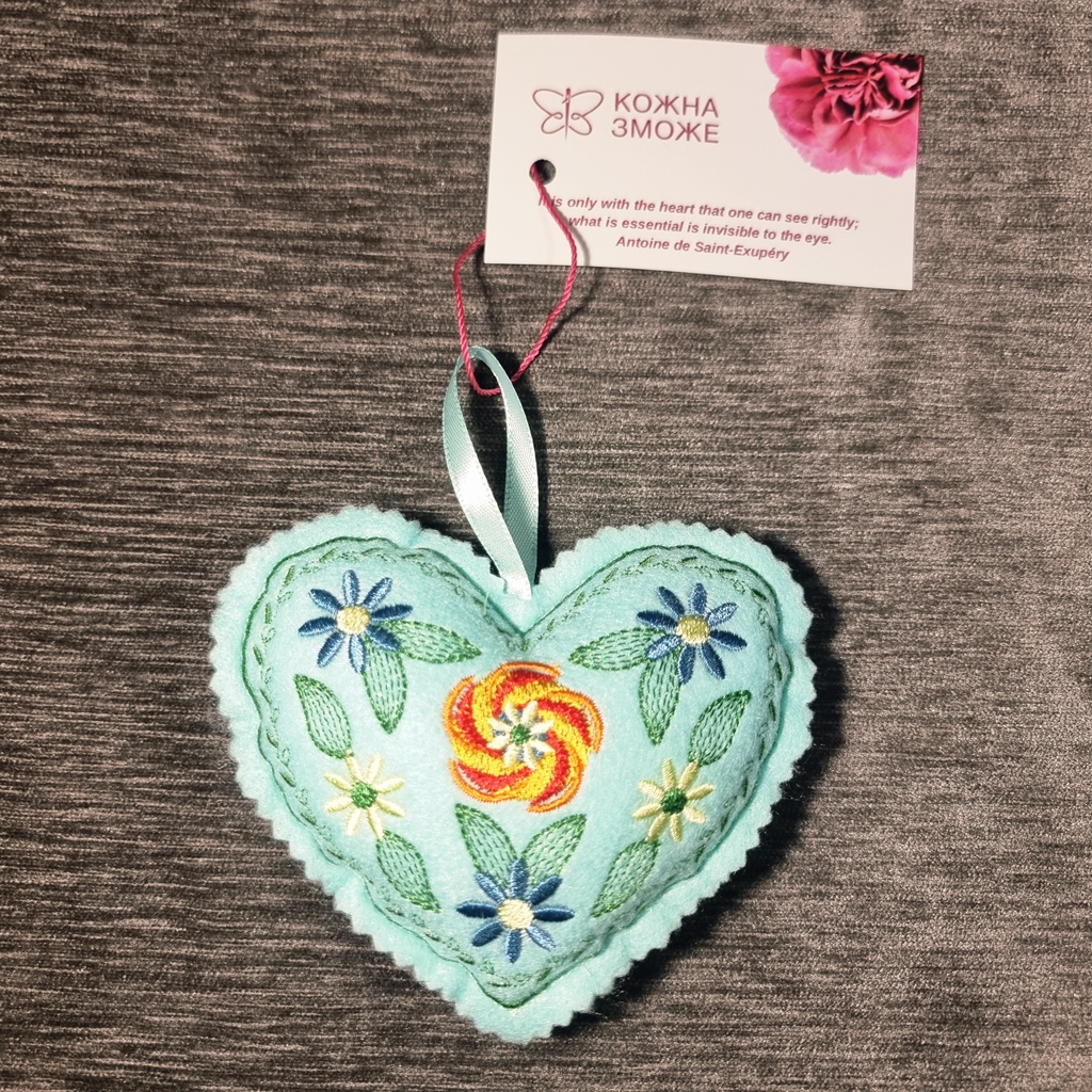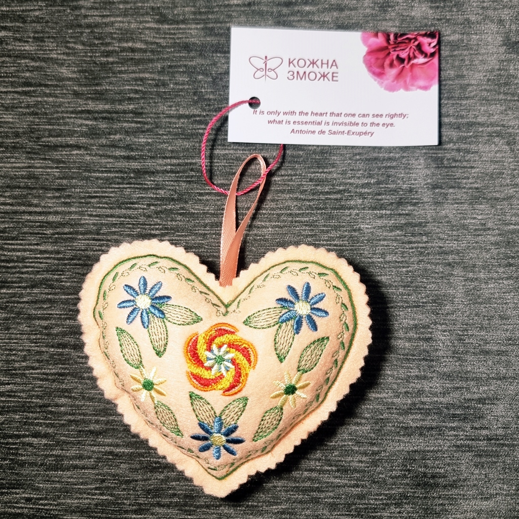 Розмір Серця 11х11 см. Вишивка на фетр, за мотивами наддніпрянських орнаментів. Підвіска – атласна стрічка довжиною 5-6 см. Кольори: блакитний, жовтий, персиковий.